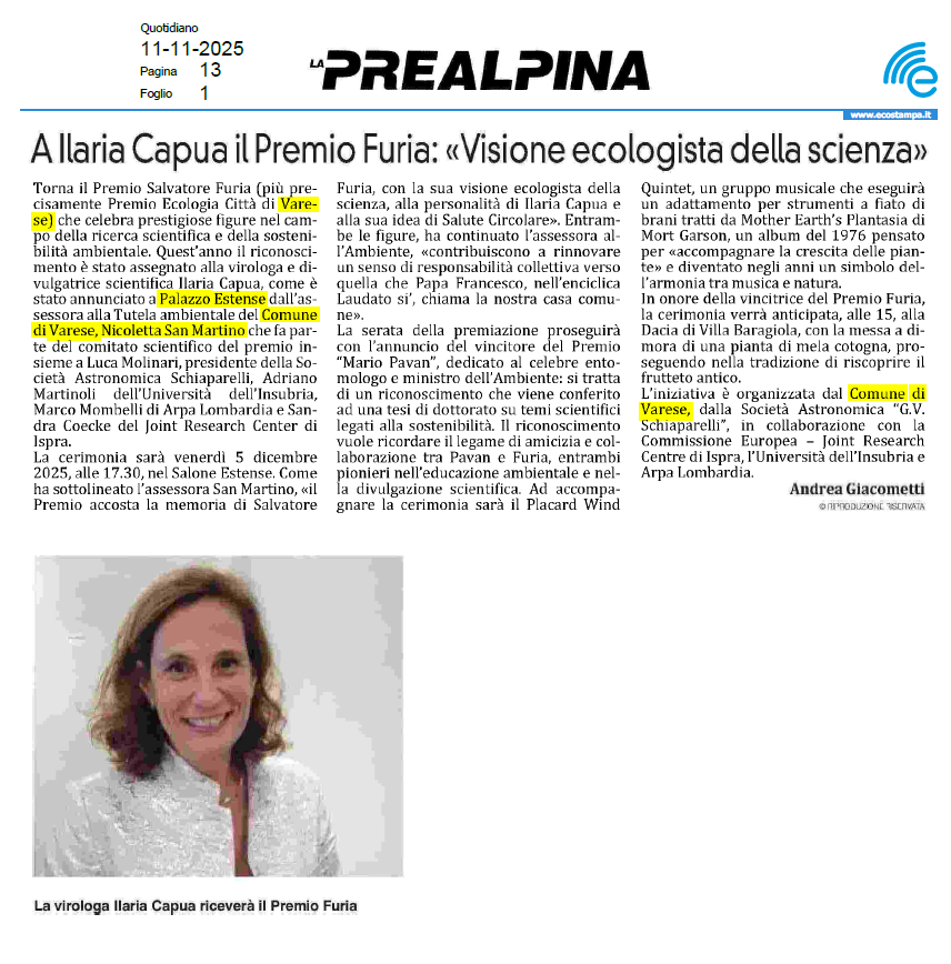 A Ilaria Capua il premio Furia: “Visione ecologista della scienza”